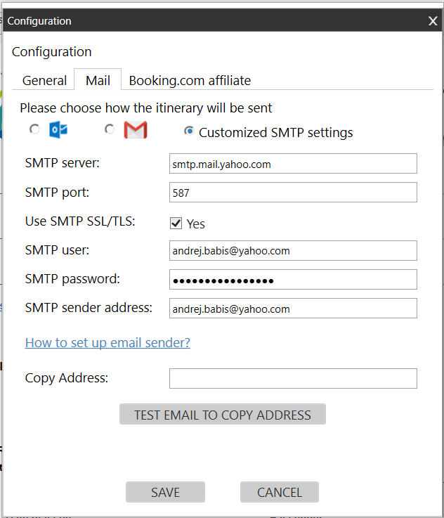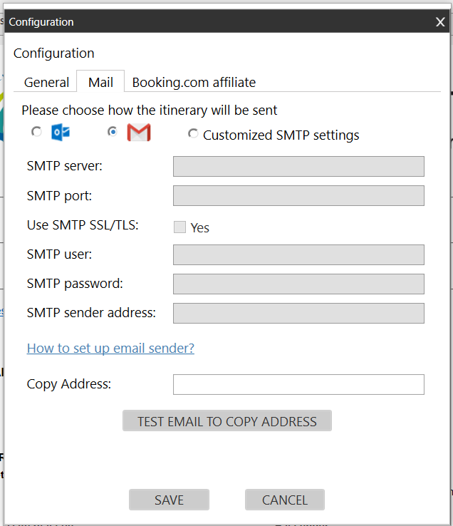 If you have MS Outlook installed on your PC and wish to send Itineraries using it, simply select this option.